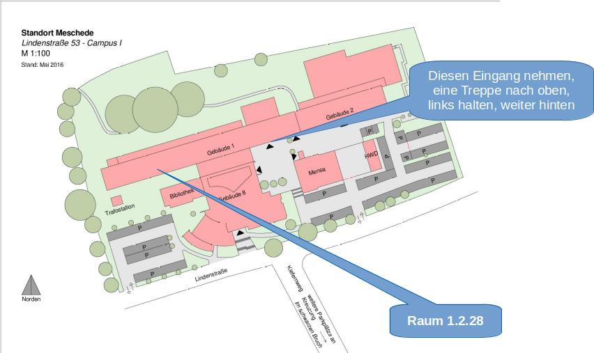 Zu Ihrer Orientierung hier eine Anfahrtsskizze und einen Wegweiser zum Raum 1.2.8