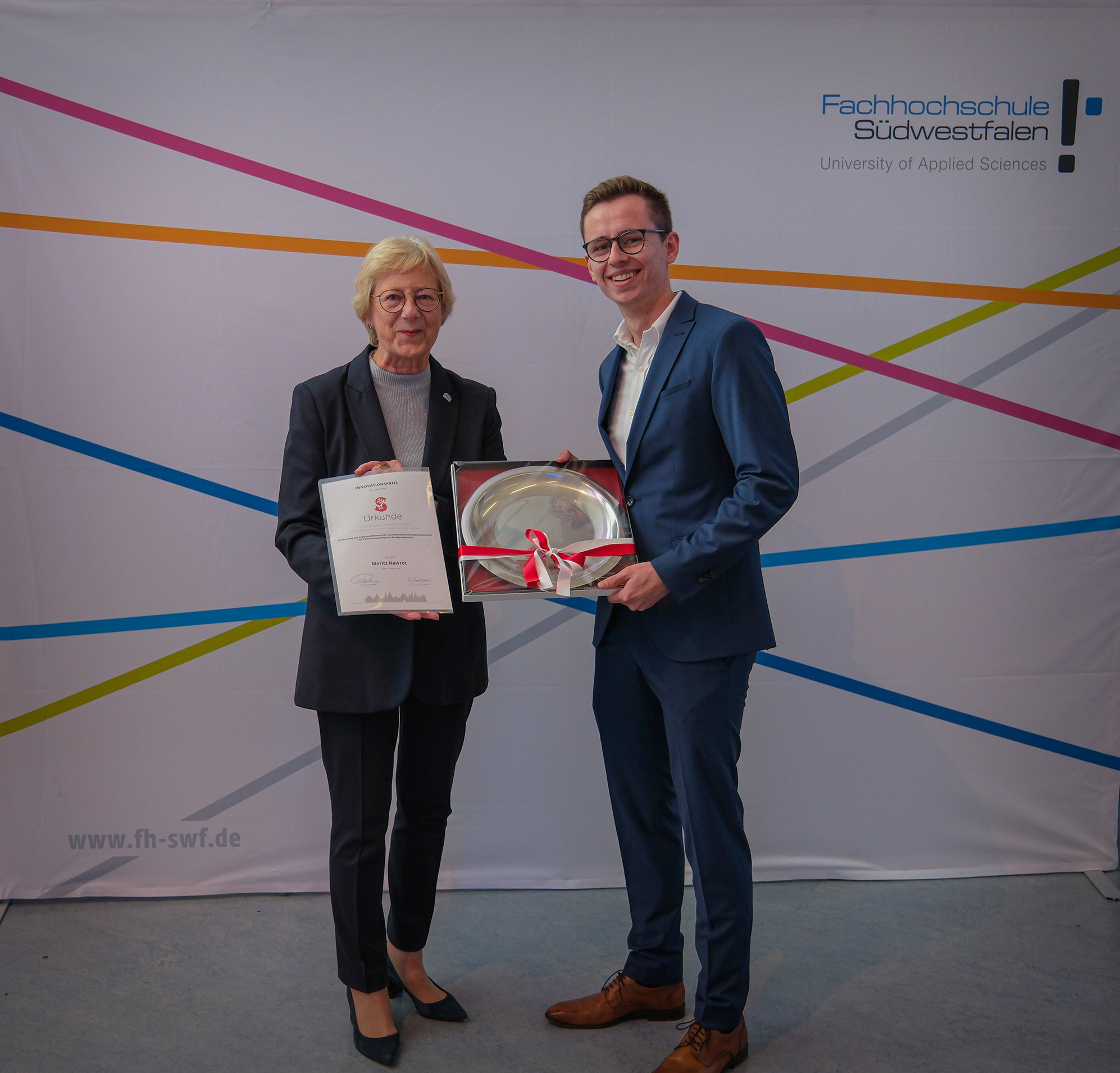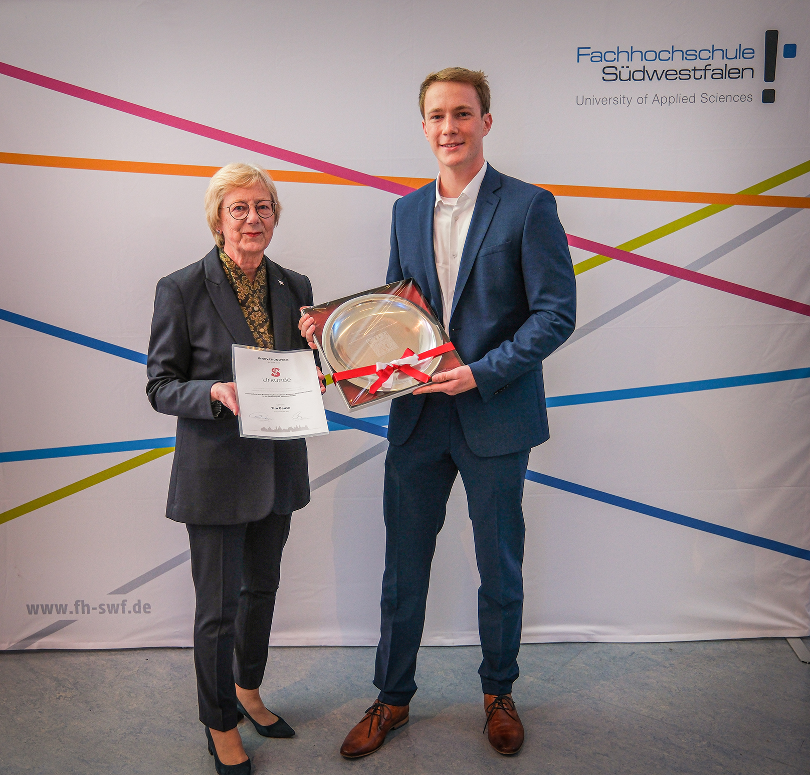 Der zweite Innovationspreis der Stadt Soest ging an Tim Bause, Absolvent des berufsbegleitenden weiterbildenden Master-Studiengangs Technik- und Unternehmensmanagement. Bause hatte sich im Rahmen seiner Arbeit mit der Ausarbeitung und Anwendung konstruktiver Methoden zur Kostensenkung in der Fertigung der Volkmann GmbH befasst. Betreut wurde die Arbeit von Prof. Dr. Thorsten Frank.