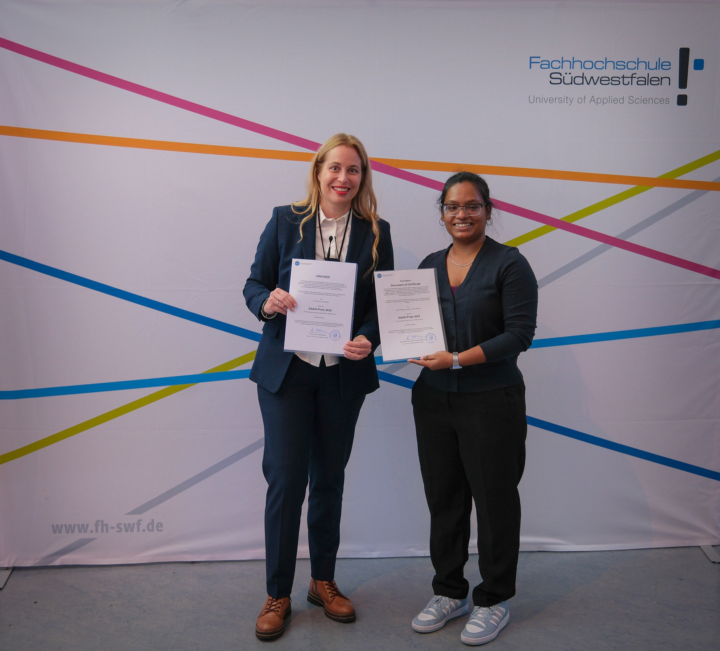 Im Rahmen der Abschlussfeier des Fachbereichs Elektrische Energietechnik wurde auch der mit 1.000 Euro dotierte Preis des Deutschen Akademischen Austauschdienstes (DAAD) für hervorragende Leistungen ausländischer Studierender an den deutschen Hochschulen verliehen. In diesem Jahr freut sich Keerthana Pandiyan über die hohe Auszeichnung. Die Studentin im internationalen Studiengang Systems Engineering and Engineering Management arbeitet gerade an ihrer Masterarbeit im Fachgebiet Industrielle Messtechnik. Darin beschäftigt sie sich mit der Optimierung von Förderprozessen in der Zementindustrie auf Basis von Simulation und Künstlicher Intelligenz. Sie ist Mitglied einer internationalen Arbeitsgruppe im Rahmen der Durchführung eines vom Bundesministerium für Wirtschaft und Energie geförderten Projekts. Nicht nur ihre professionelle Arbeitsweise im Kontakt mit Projektpartner*innen und ihre fachlichen Leistungen haben überzeugt, Keerthana Pandiyan hat sich am Fachbereich insbesondere durch ihr außerordentliches und beständiges soziales Engagement für die internationale Studierendengemeinschaft einen Namen gemacht. Als wissenschaftliche Hilfskraft bereichert sie das Leben und Lernen sowie die Integration der Studierenden nachhaltig, begleitet Exkursionen und hat darüber hinaus neue Formate initiiert, die das Ankommen in der deutschen Kultur sowie die Vernetzung unter Studierenden und Lehrenden fördern.