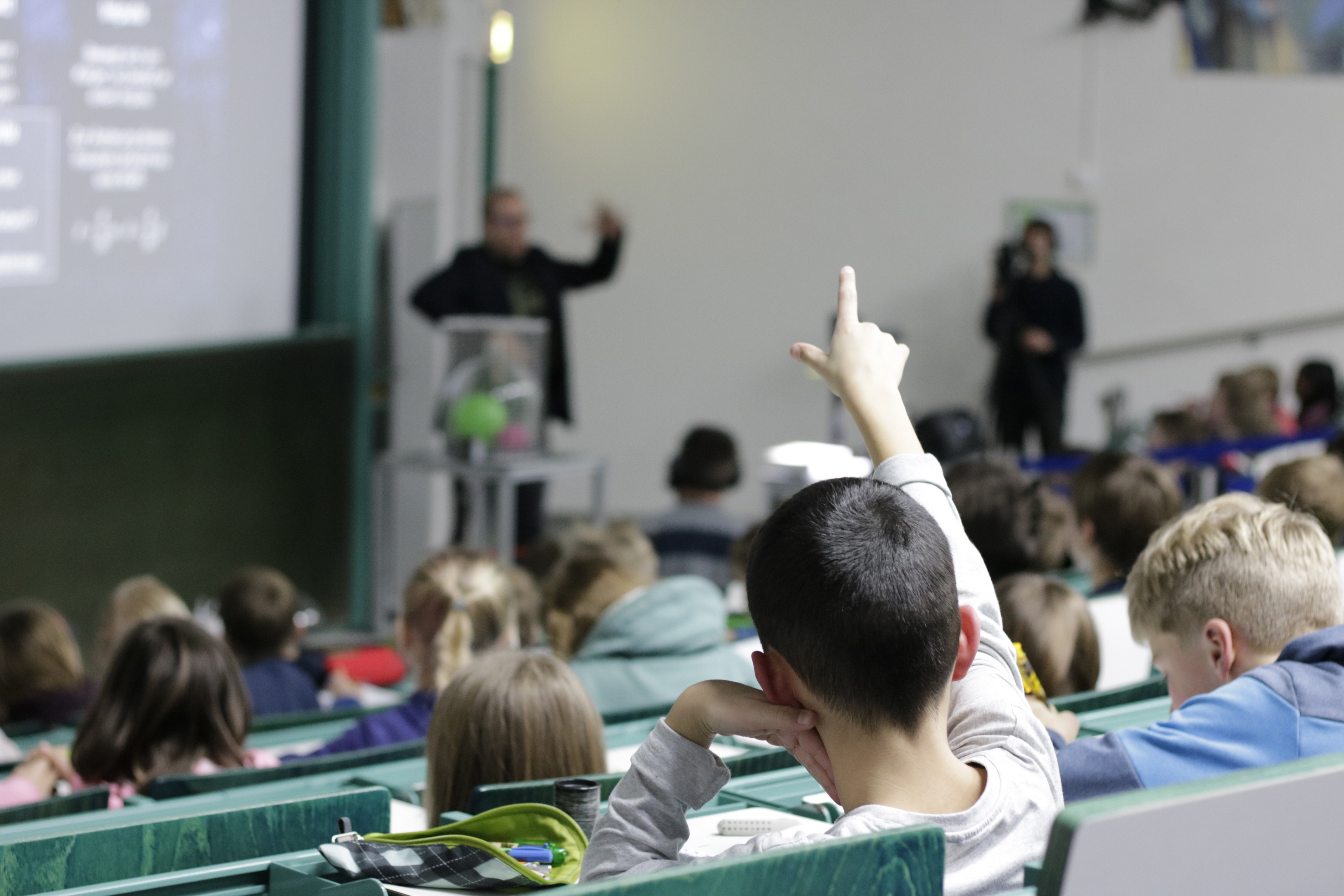Erwachsene haben zur Kinder-Uni keinen Zutritt. Damit sie hinterher aber noch mitreden können, dürfen sie und auch jüngere oder ältere Geschwisterkinder die Vorlesung im Foyer auf der Videoleinwand mitverfolgen. Während der Kinder-Uni bietet die Mensa „da Vinci“ Kaffee und Kuchen an.